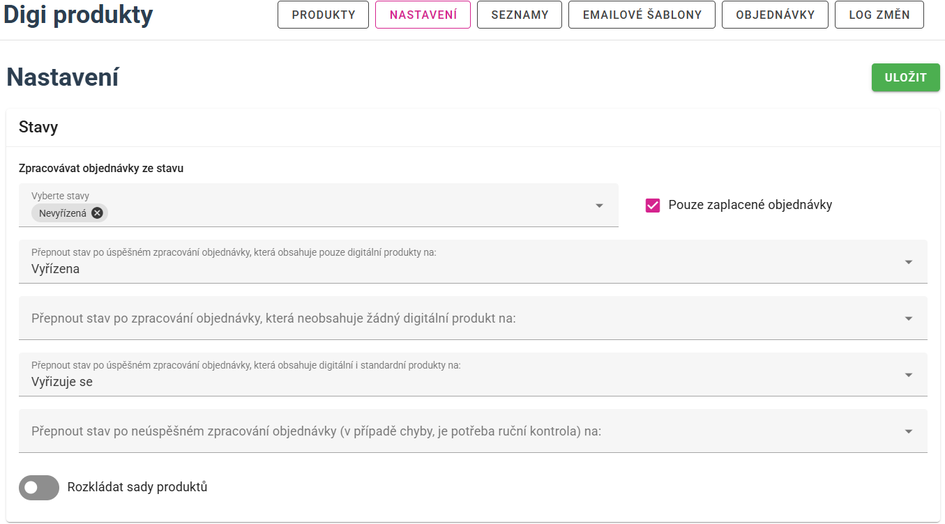 V administraci doplňku Digitální produkty nyní přejdete na záložku Nastavení, kde si napárujete příslušné stavy objednávek.