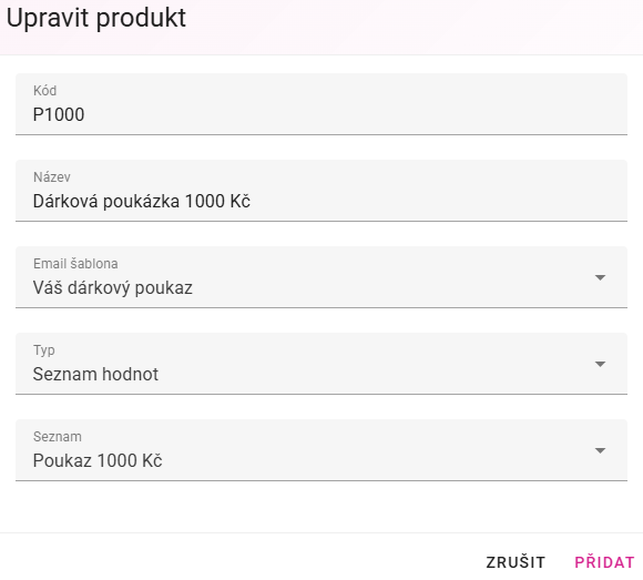 Přejdete do administrace doplňku Digitální produkty a vytvoříte nový produkt - na záložce Produkty přes tlačítko Přidat produkt v pravém horním rohu. Následně vyplníte Název Dárková poukázka 1000 Kč, Kód produktu stejný jako v Shoptetu, na našem příkladu P1000. U Typu hodnoty zvolíte Seznam hodnot - napárujete Šablonu, kterou jste si už vytvořili a zvolíte příslušný Seznam hodnot. Potvrdíte tlačítkem Uložit produkt.