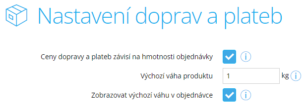 V levém menu v Shoptetu přejdete do části Nastavení › Nastavení doprav a plateb, kde aktivujete Cena dopravy a plateb závisí na hmotnosti objednávky a Zobrazovat výchozí váhu při objednávce. Do pole Výchozí váha produktu pak můžete vyplnit průměrnou váhu standardních objednávek - na našem příkladu 1 kg.